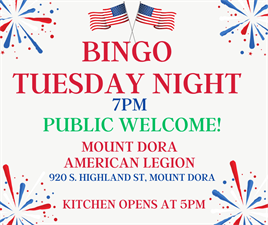 Weekly Bingo at the American Legion. Kitchen open from 5-8. Public Welcome
