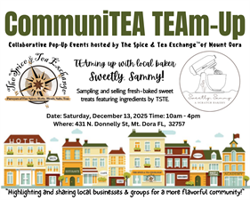Join us for another CommuniTEA TEAm-Up event!We are welcoming back local baker, Sweetly, Sammy!Sweetly, Sammy will be offering winter-inspired, fresh-baked sweet treats featuring ingredients from TSTE!Pre-orders available: (to be provided)Cozy Cocoa will be ready to go at the Tea Bar!Event is from 10am - 4pm (or until sold out)Snow in the Park will be going on in Donnelly Park from 3-7. This is the perfect opportunity to grab some sweet treats and spend quality time with your family!
